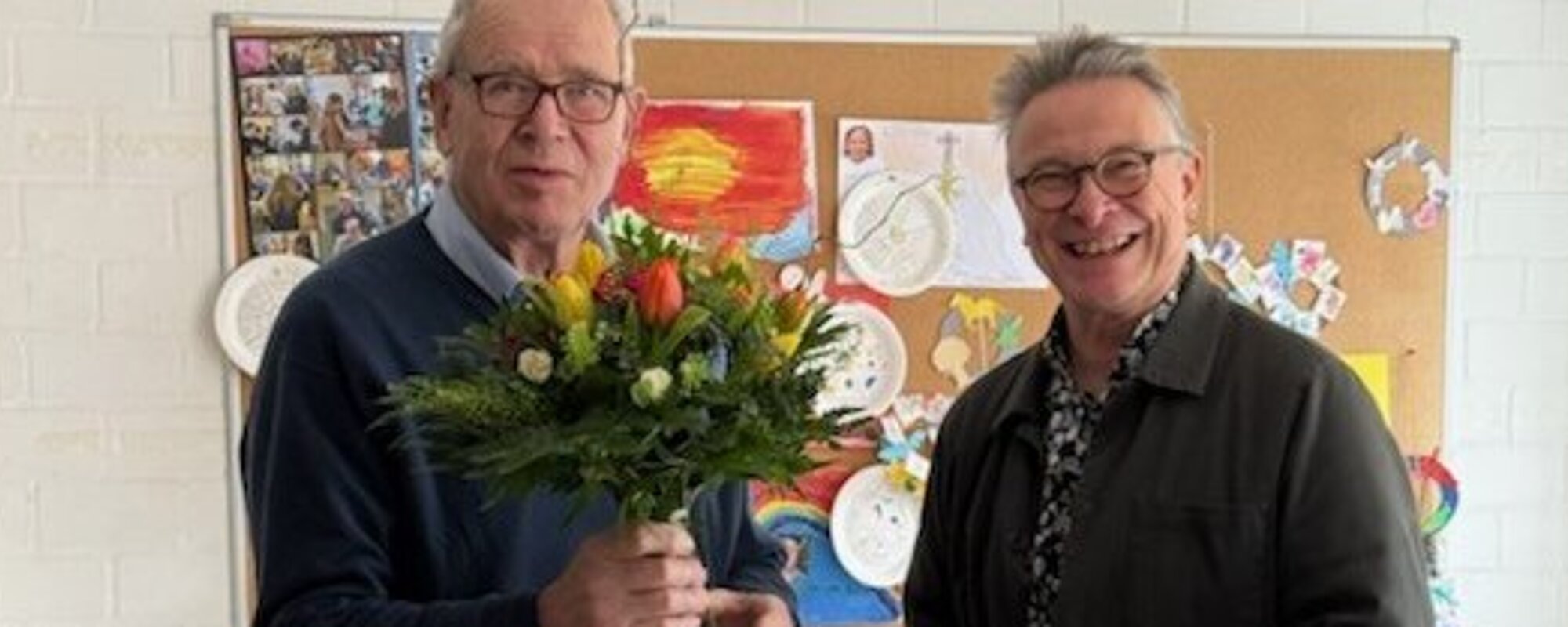 Mit einem Blumenstrauß dankt KMD Christoph D. Minke Dietrich Voß für seine unermüdliche Arbeit im Dienst der Kirchenmusik, die er bereits in seiner Funktion als Pastor der Kirchengemeinde Schönberg leistete und weit darüber hinaus als Vorsitzender des "Freundeskreis der Kirchenmusik in Schönberg - Schönberger Musiksommer".
