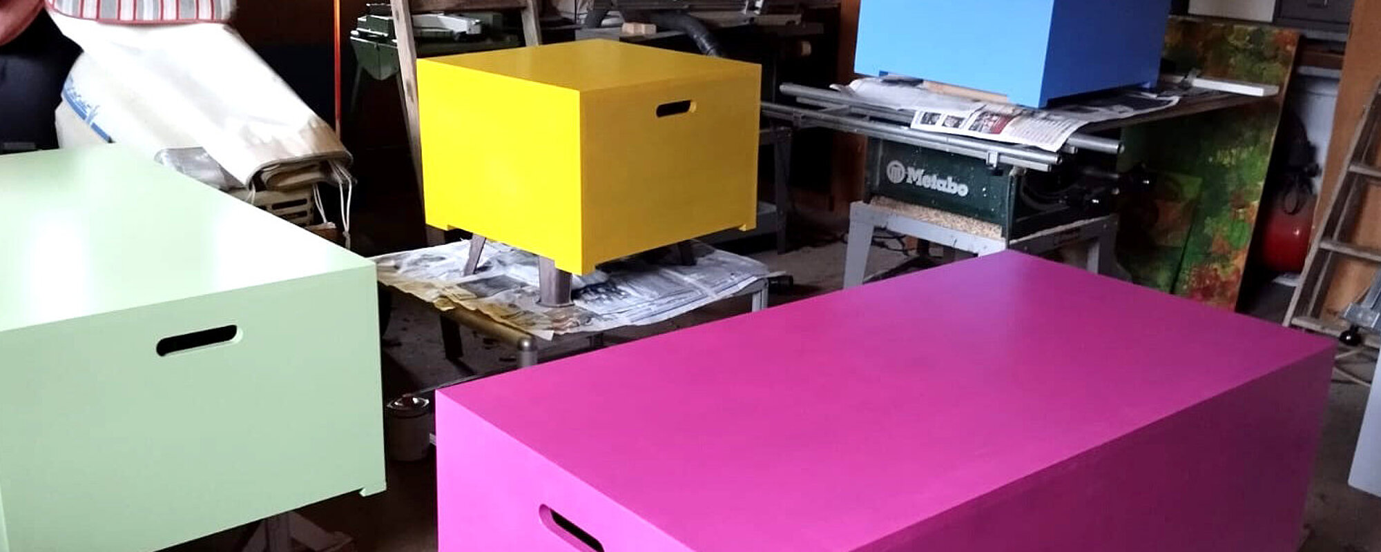 Die Entwürfe entstanden zunächst im Kunstraum der Schule und wurden anschließend mit Unterstützung regionaler holzverarbeitender Fachbetriebe fachgerecht umgesetzt. Materialwahl, Schnitte, Oberflächenbehandlung und Montage wurden dabei praxisnah begleitet.